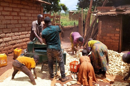 Small holder farmers threshing maize using a thresher machine